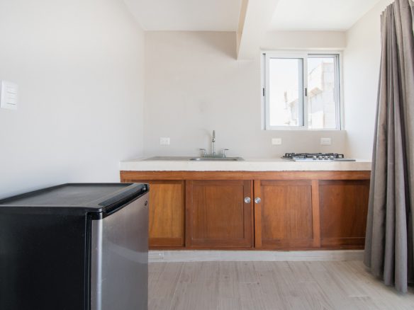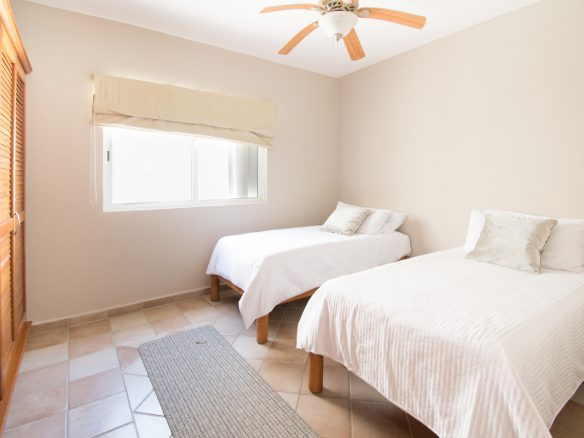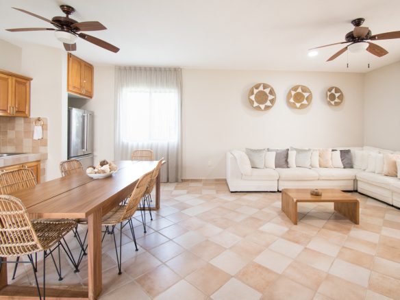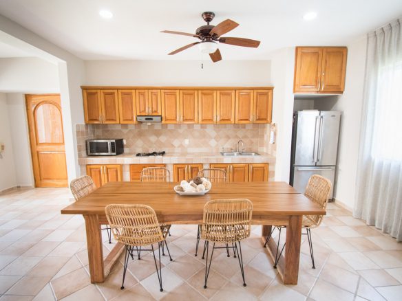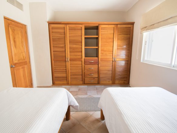 El amplio Penthouse Arcoíris se ubica en el segundo nivel del edificio, cuenta con una hermosa cocina con gabinetes de madera que conecta a la sala y comedor en su planta principal y cuenta con una pequeña terraza con vista a la alberca común. A lo largo del pasillo encontrarás un primer baño completo, seguido por la recámara secundaria con closet de madera; al fondo de éste se ubica la recámara principal con baño completo propio con closets de madera. Todos los espacios del departamento cuentan con aire acondicionado y ventiladores, se entrega amueblado y equipado.