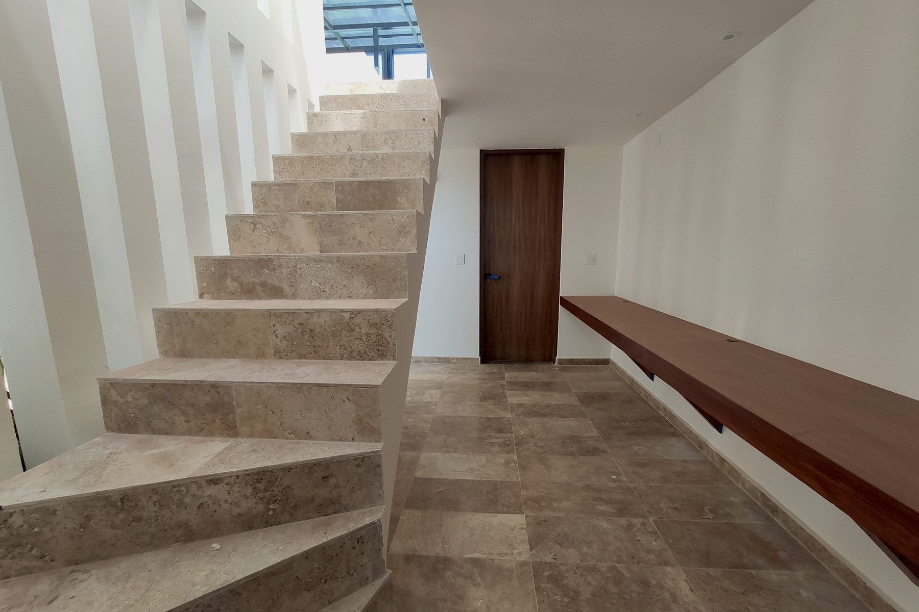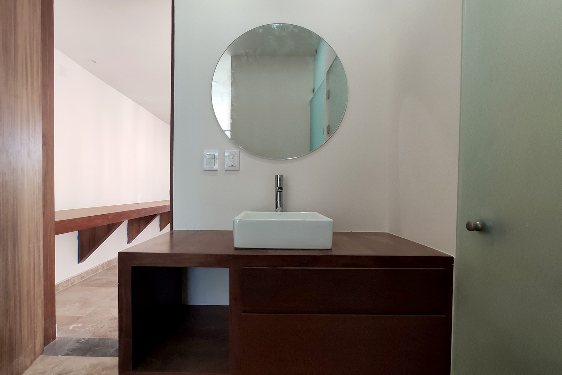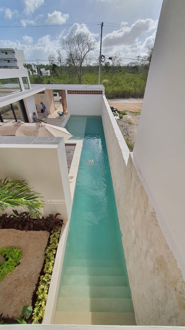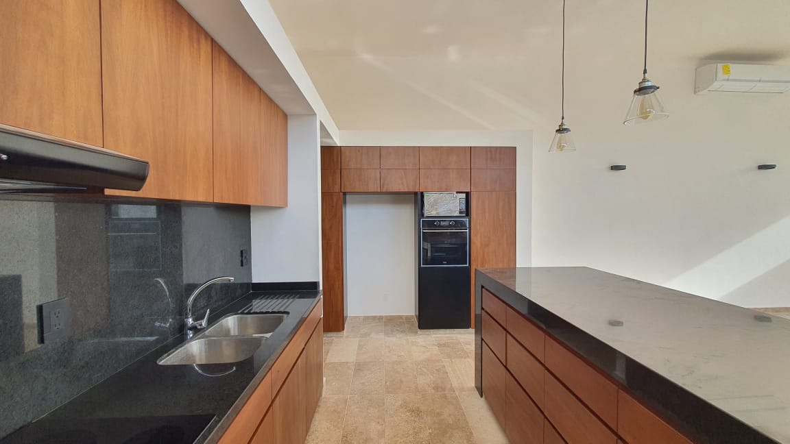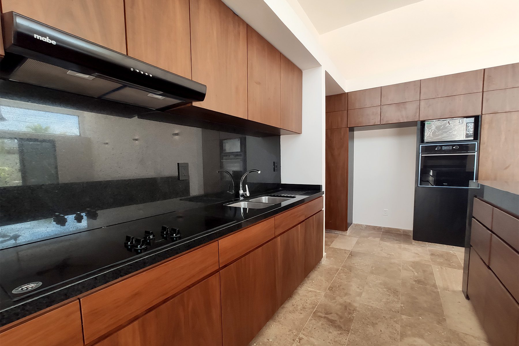 En la planta baja cuenta con una hermosa piscina con deck de madera, 2 espacios de estacionamiento, patio interior, lavandería, 3 habitaciones cada una con baño y terraza propia, sala, comedor, un baño completo de visitas, cocina abierta estilo americano. La cocina está muy bien equipada con refrigerador, horno de microondas, parrilla eléctrica, campana, horno, tarja.