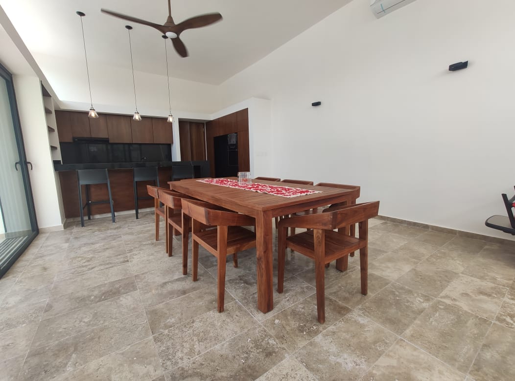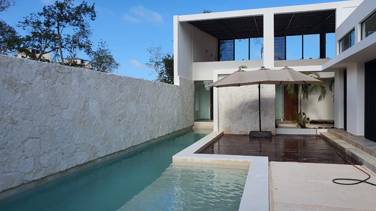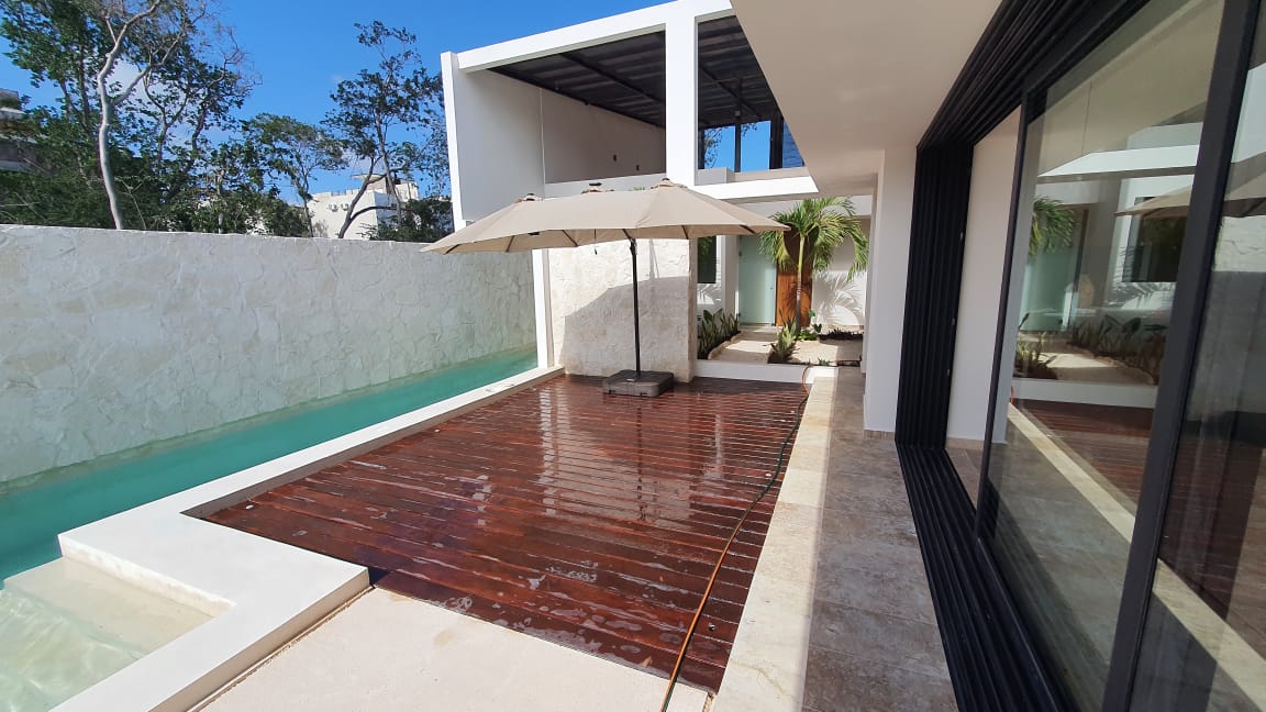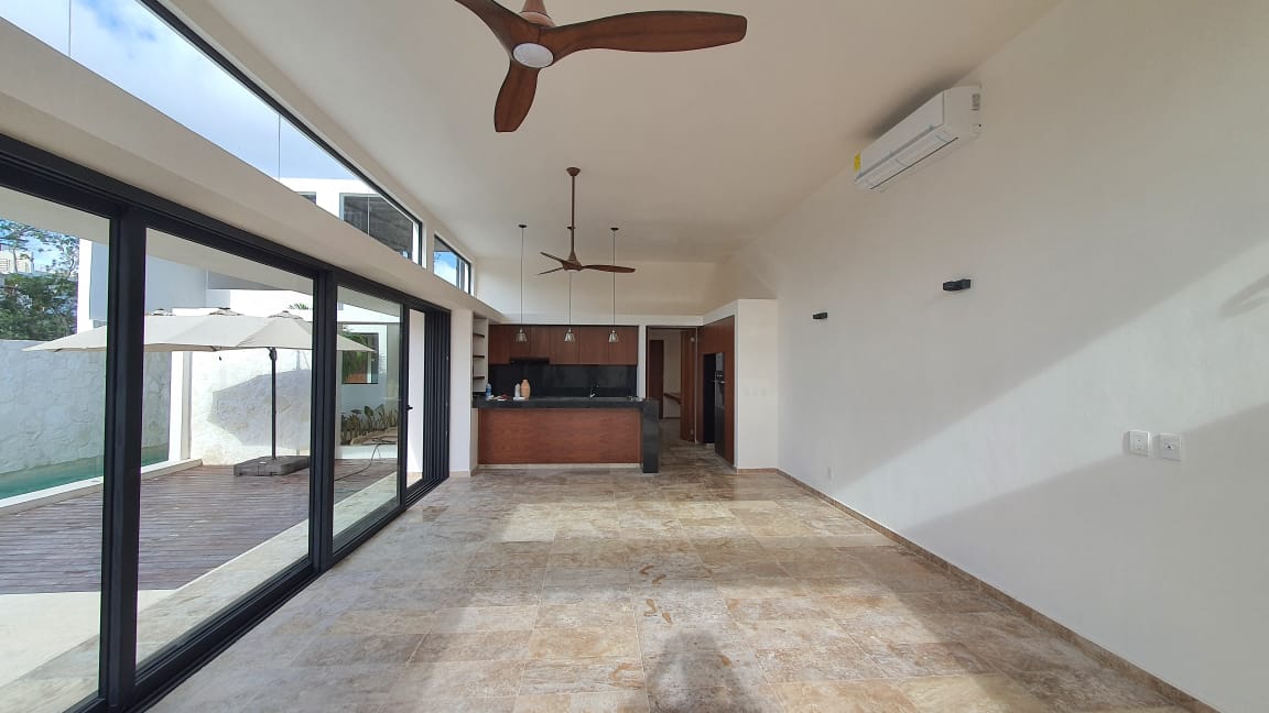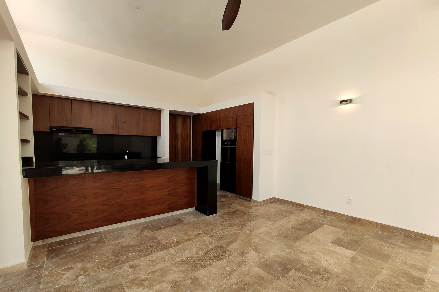 En la planta baja cuenta con una hermosa piscina con deck de madera, 2 espacios de estacionamiento, patio interior, lavandería, 3 habitaciones cada una con baño y terraza propia, sala, comedor, un baño completo de visitas, cocina abierta estilo americano. La cocina está muy bien equipada con refrigerador, horno de microondas, parrilla eléctrica, campana, horno, tarja.