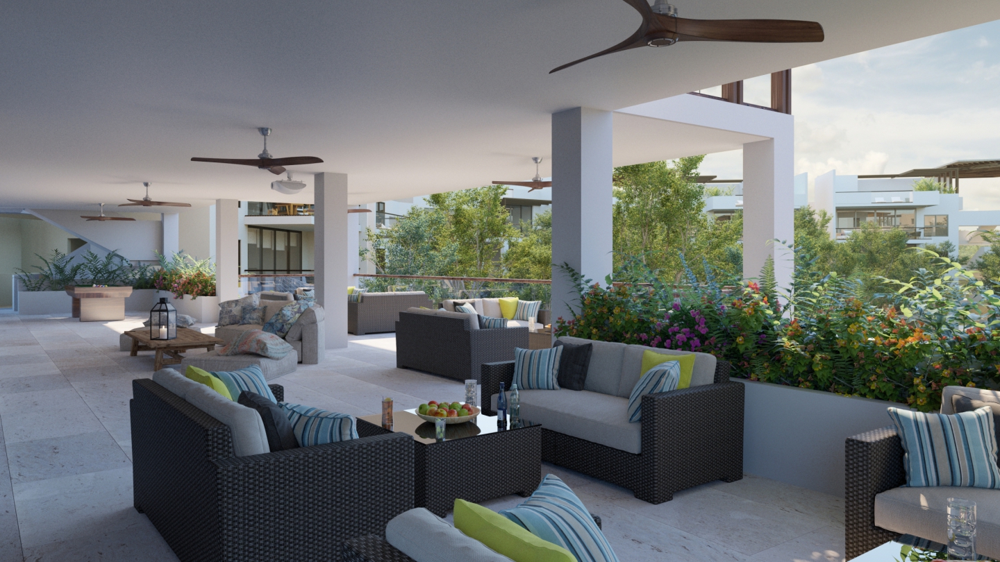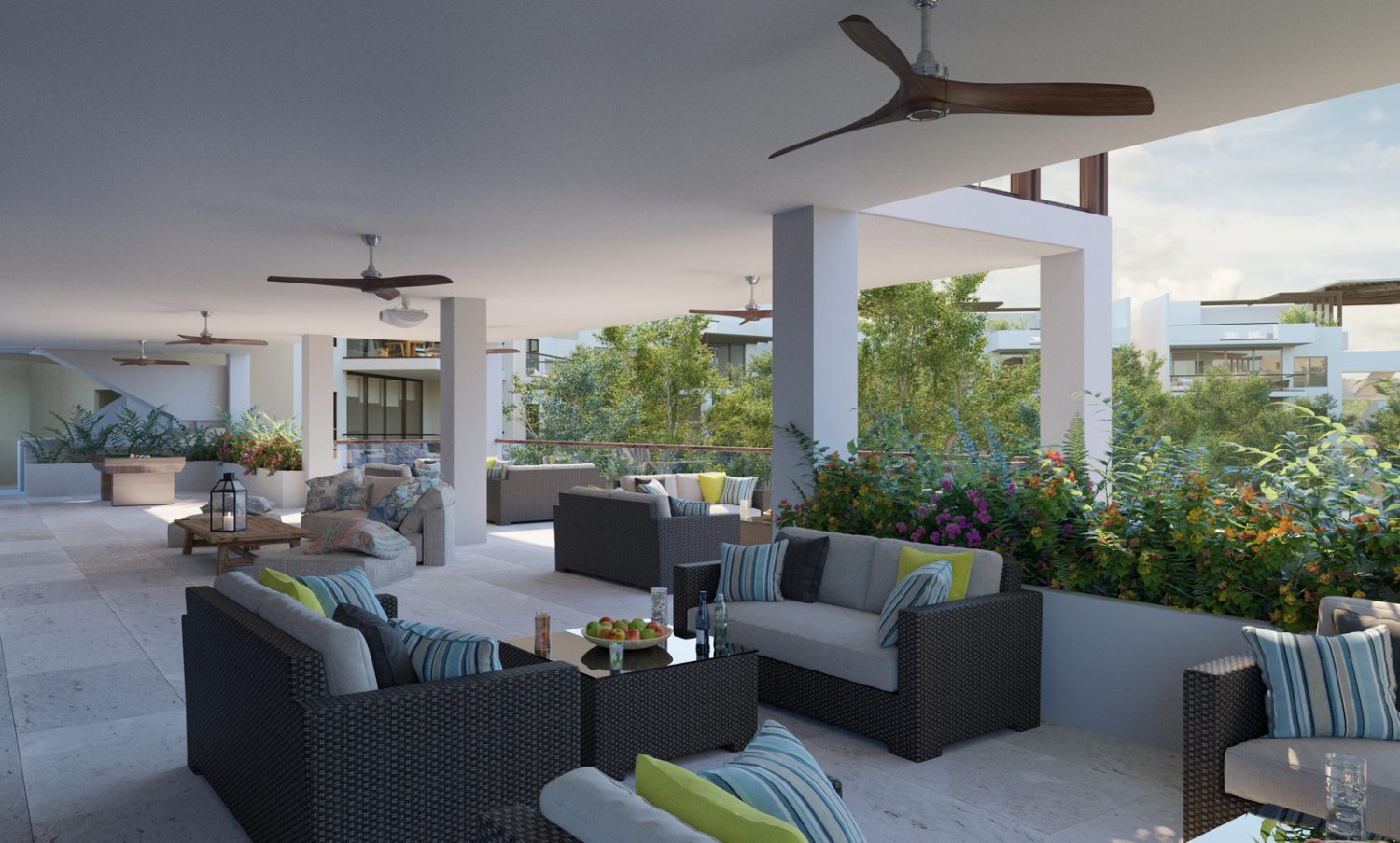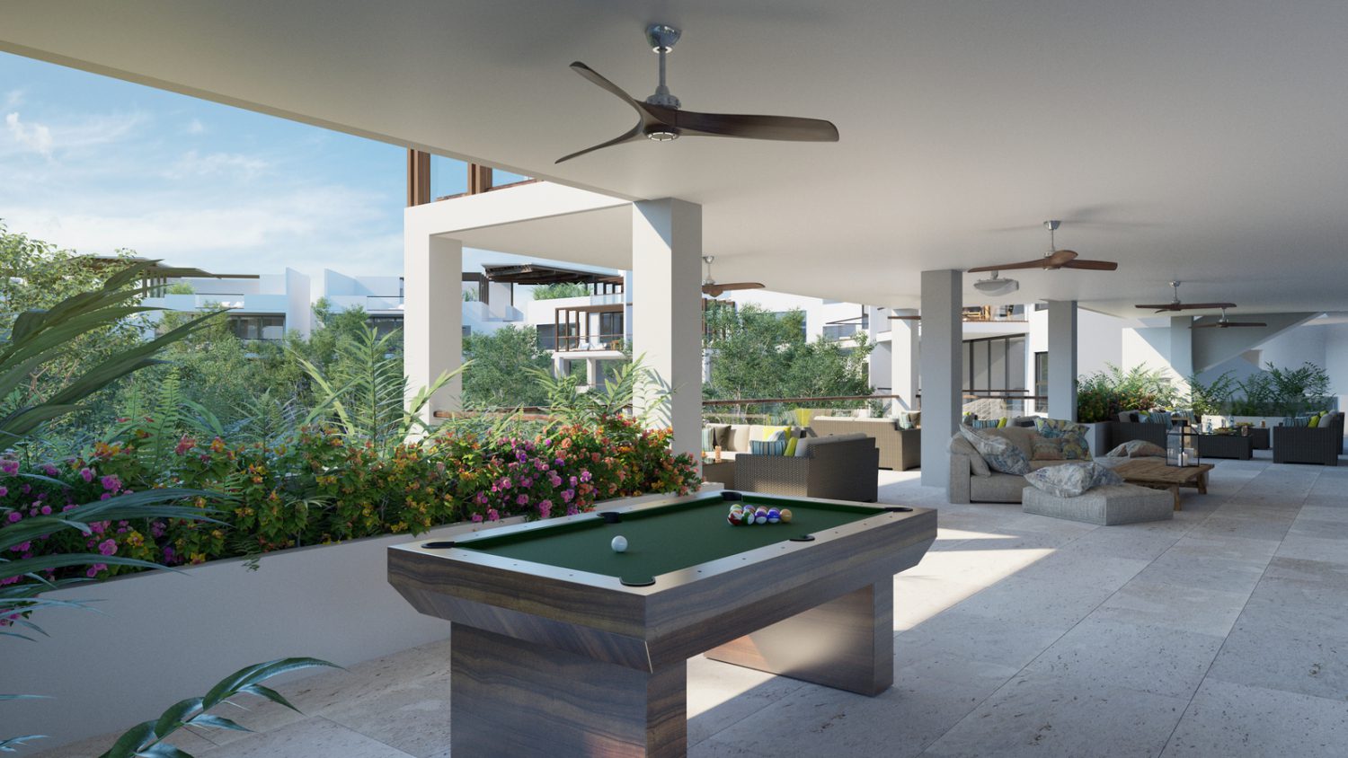Una de las particularidades de Yaxlum Tulum es que por cada 16 departamentos hay una zona de amenidades en la segunda planta que cuenta con: área lounge, gimnasio, jacuzzi y barra.
