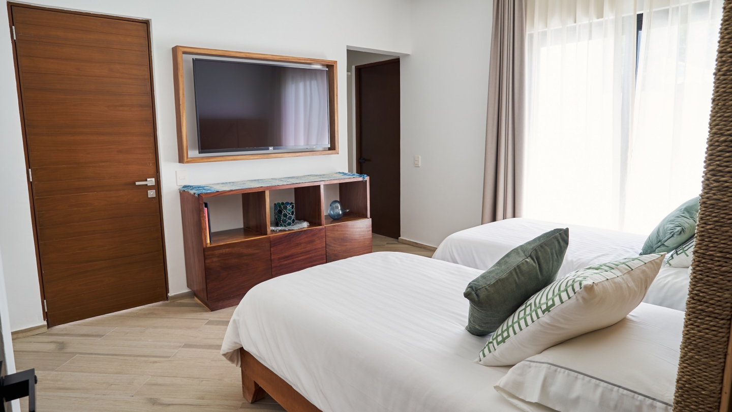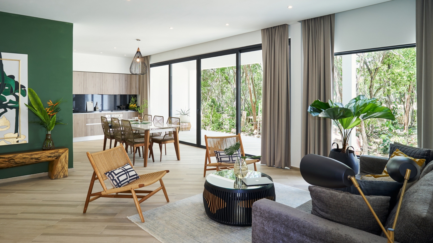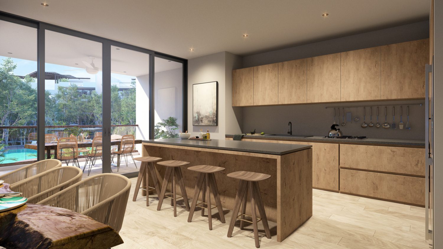 Una de las particularidades de Yaxlum Tulum es que por cada 16 departamentos hay una zona de amenidades en la segunda planta que cuenta con: área lounge, gimnasio, jacuzzi y barra.