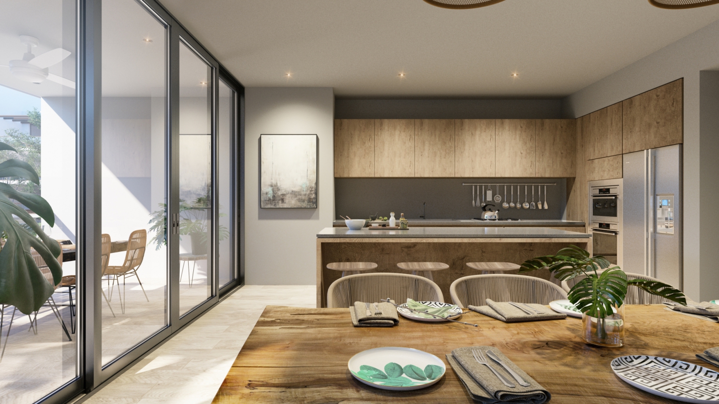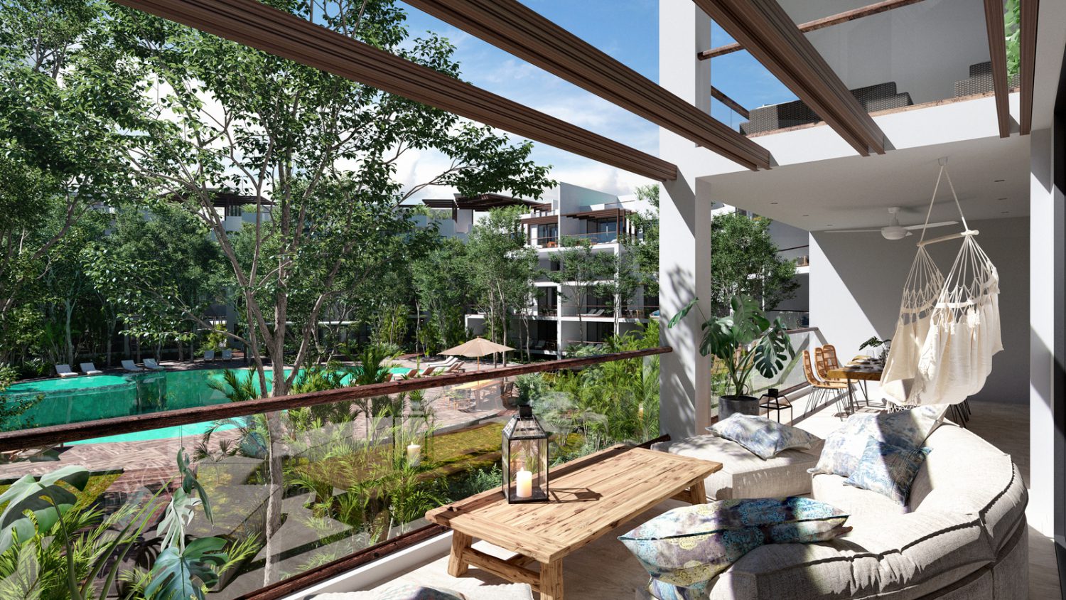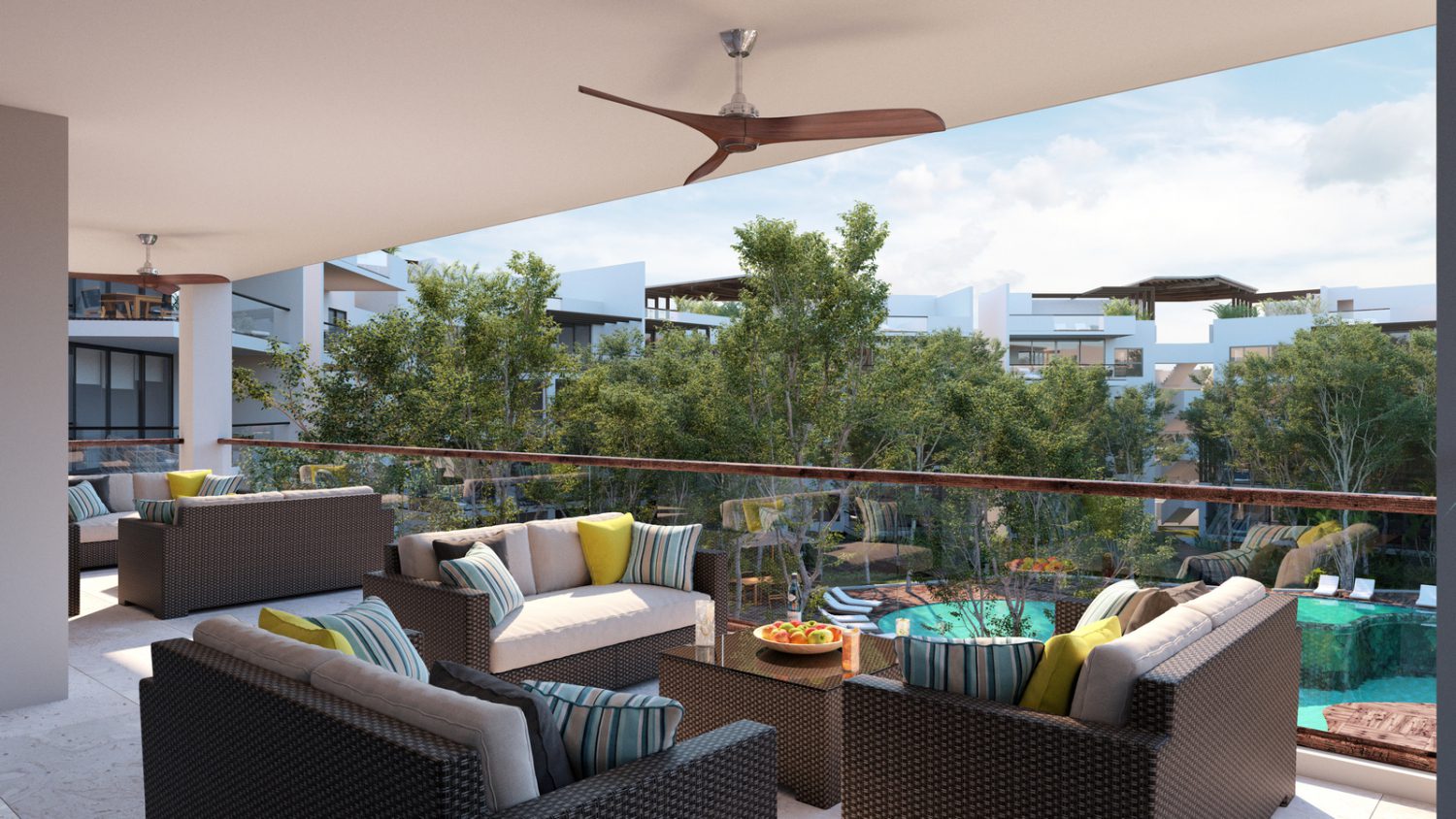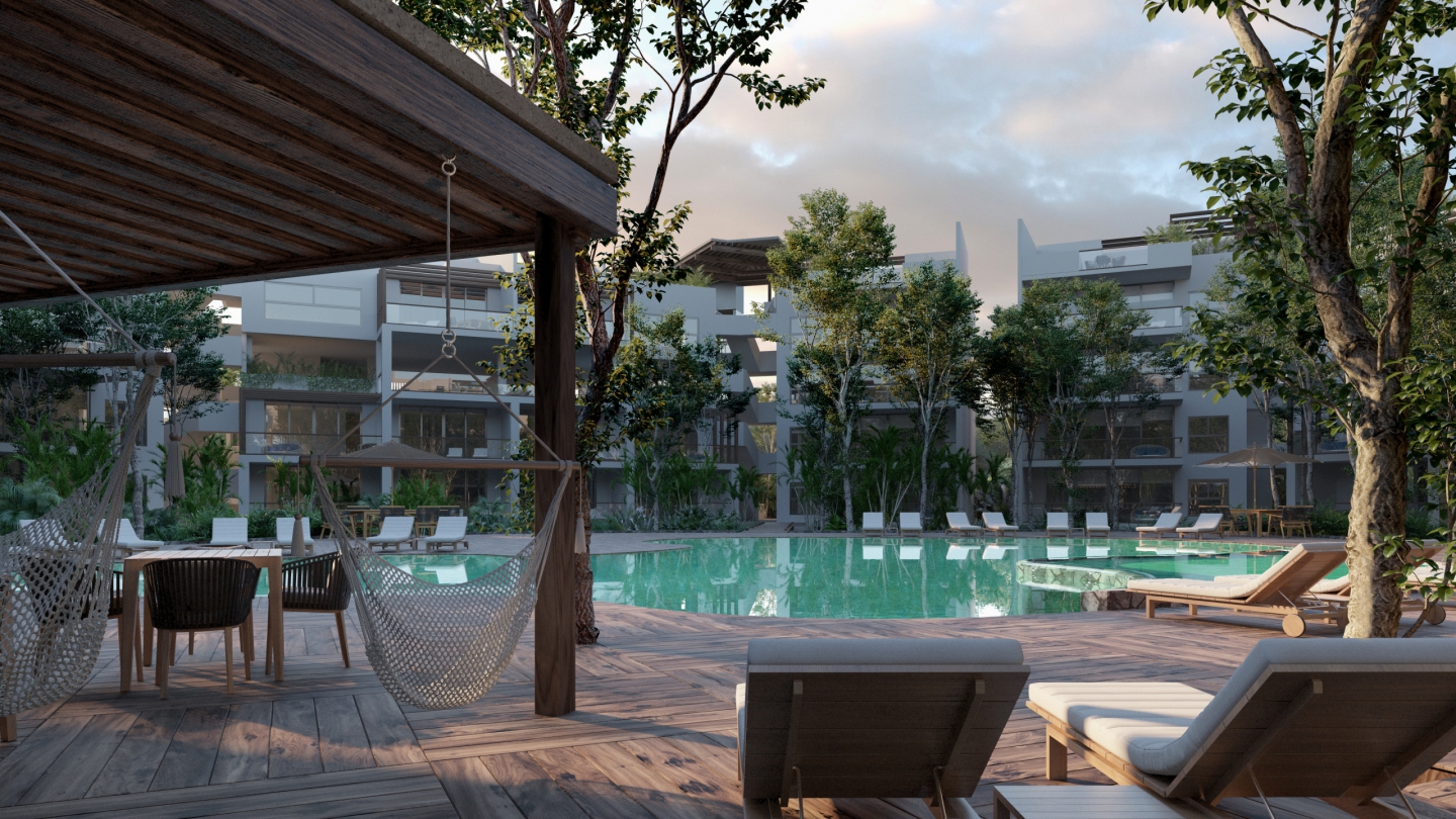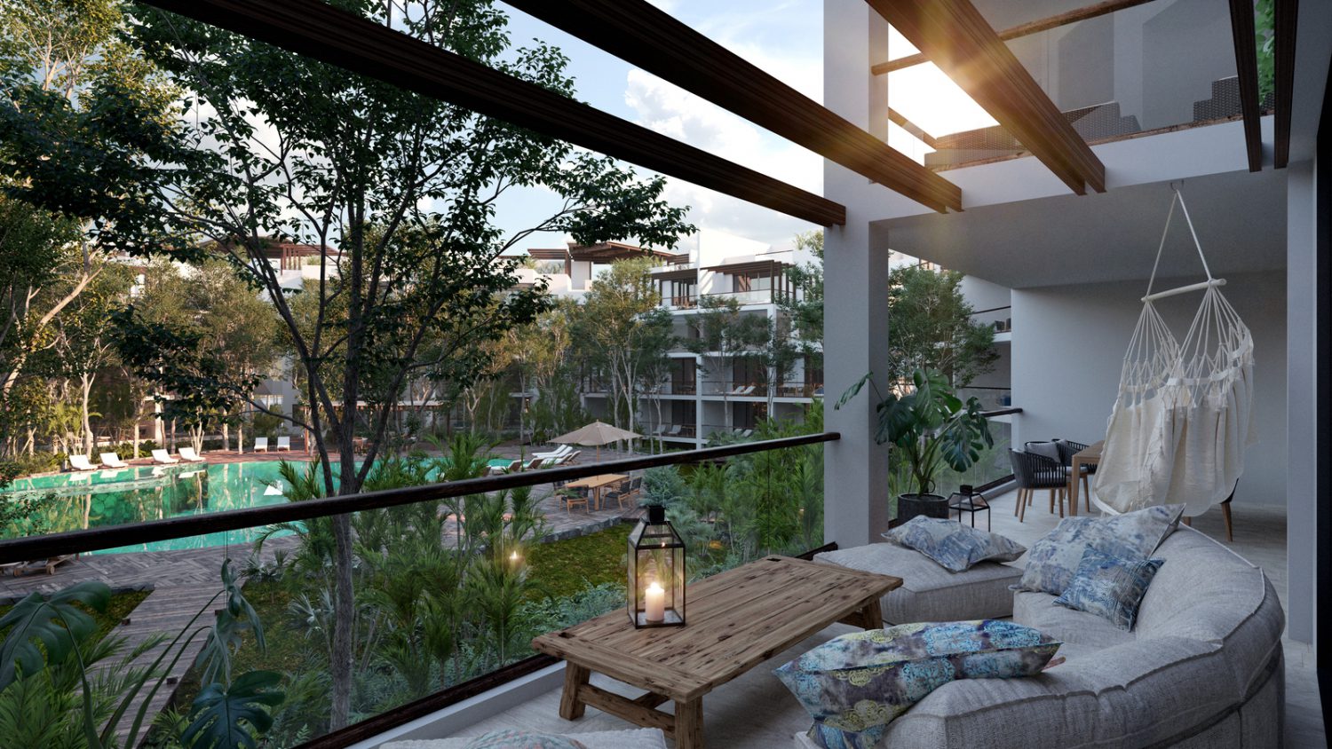 YAAXLUM TULUM está conformado por torres interconectadas de manera circular Una propuesta arquitectónica que facilita la conexión entre sus habitantes y el esparcimiento en las áreas comunes, por lo tanto este diseño permite a los propietarios tener vistas internas de vegetación que se ha conservado que jamás será impactada.
